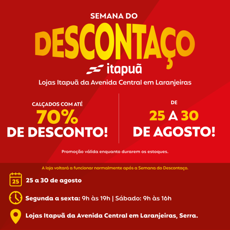 🎉 Chegou em Serra! Semana do Descontaço Itapuã traz até 70% OFF em calçados para toda a família! 🎉 Se